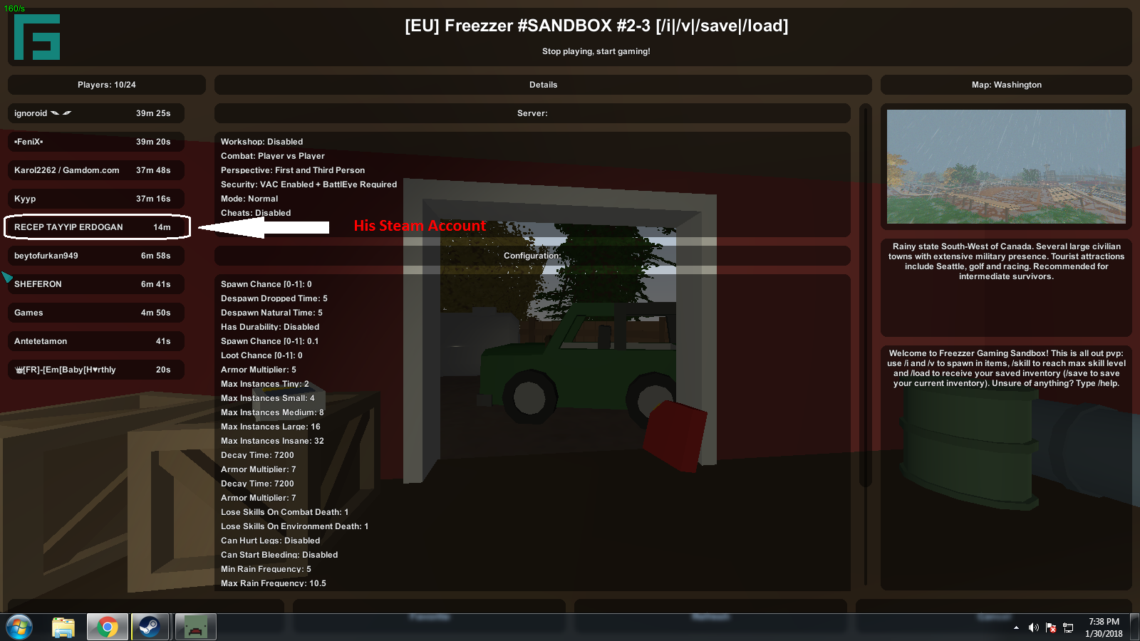someone is glitching in Freezzer 2-3 server Ken-Net 30. Januar 2018 he chat on world that he just glitch and in the second photo you can see his steam account